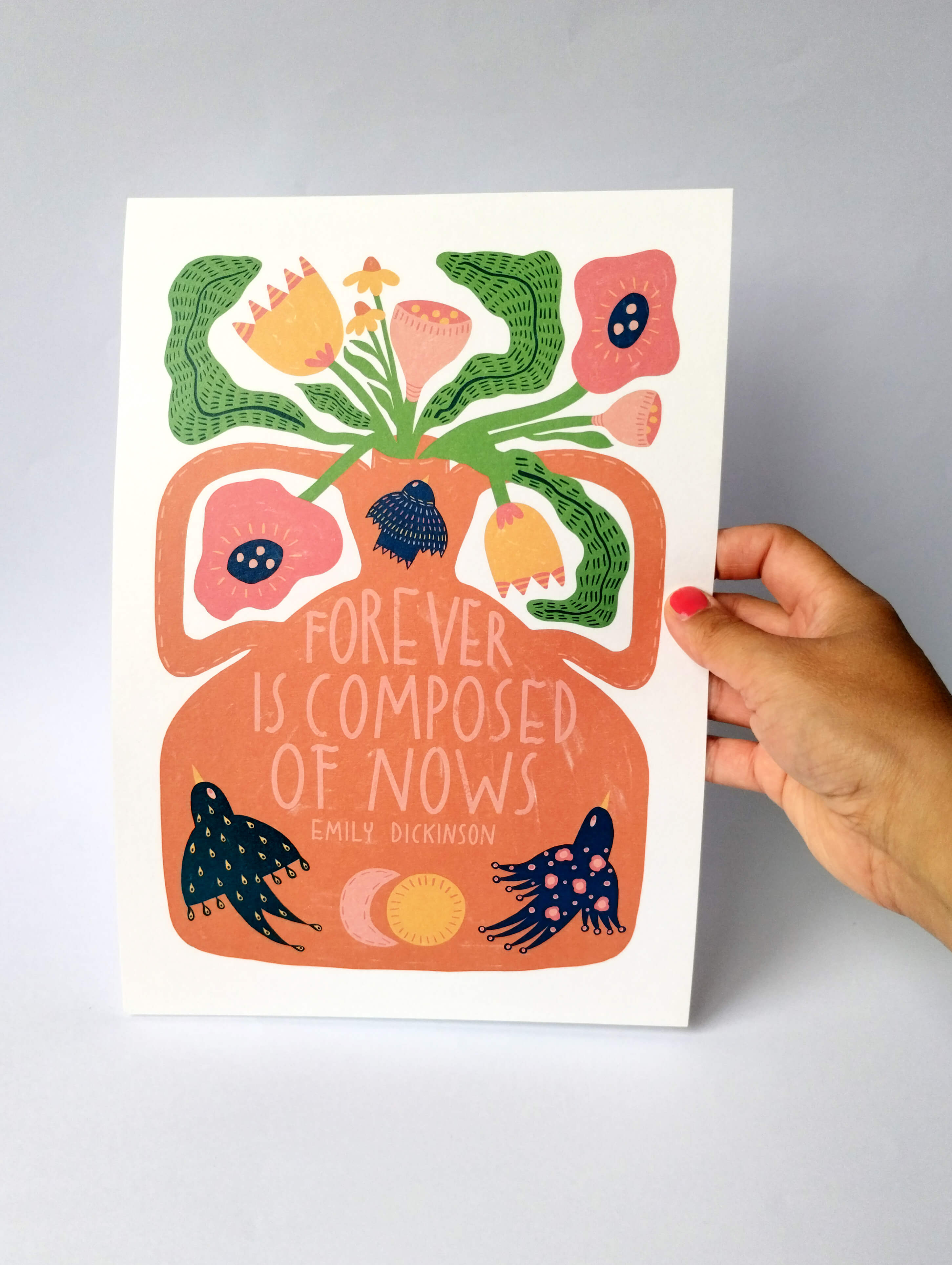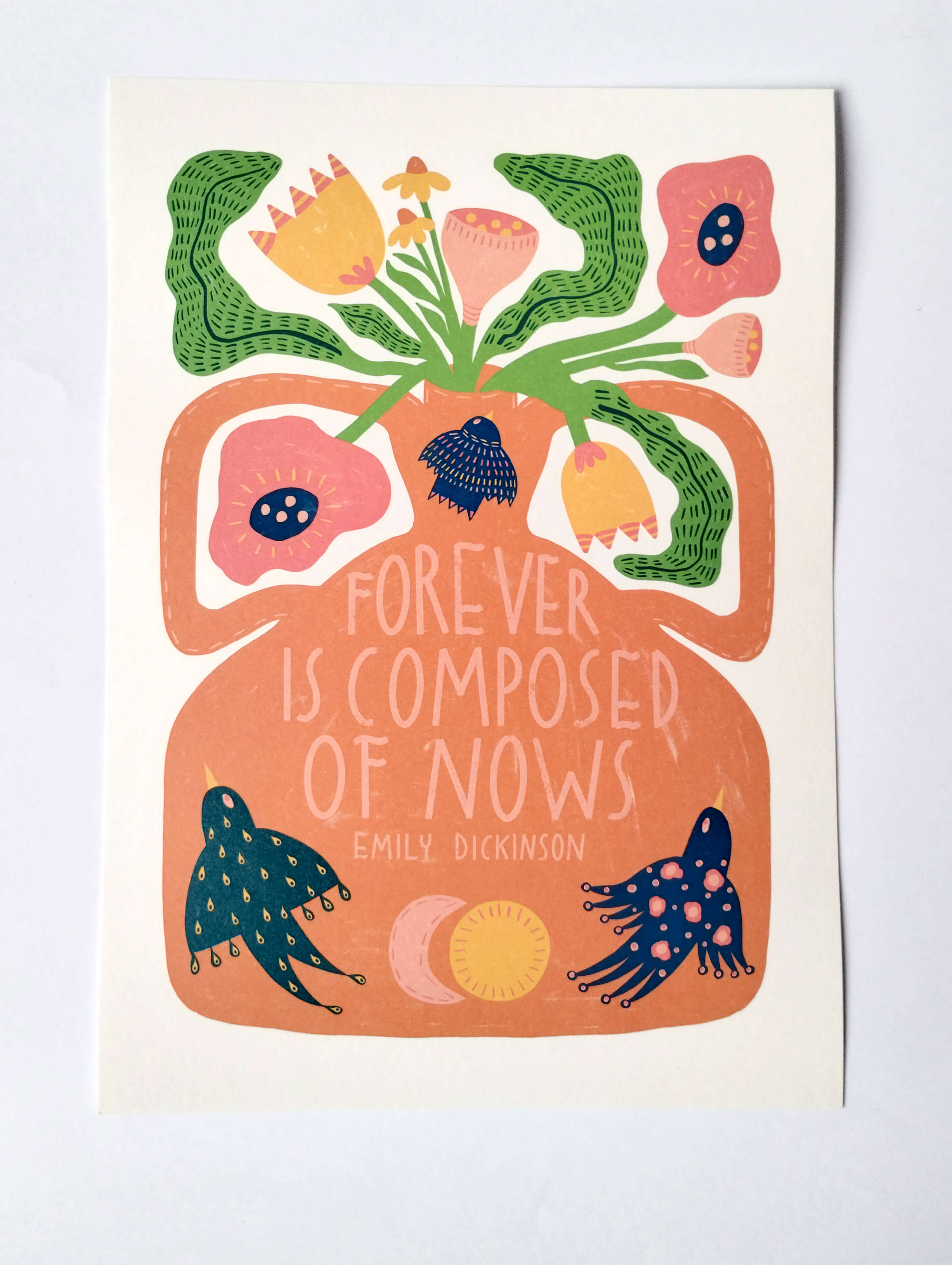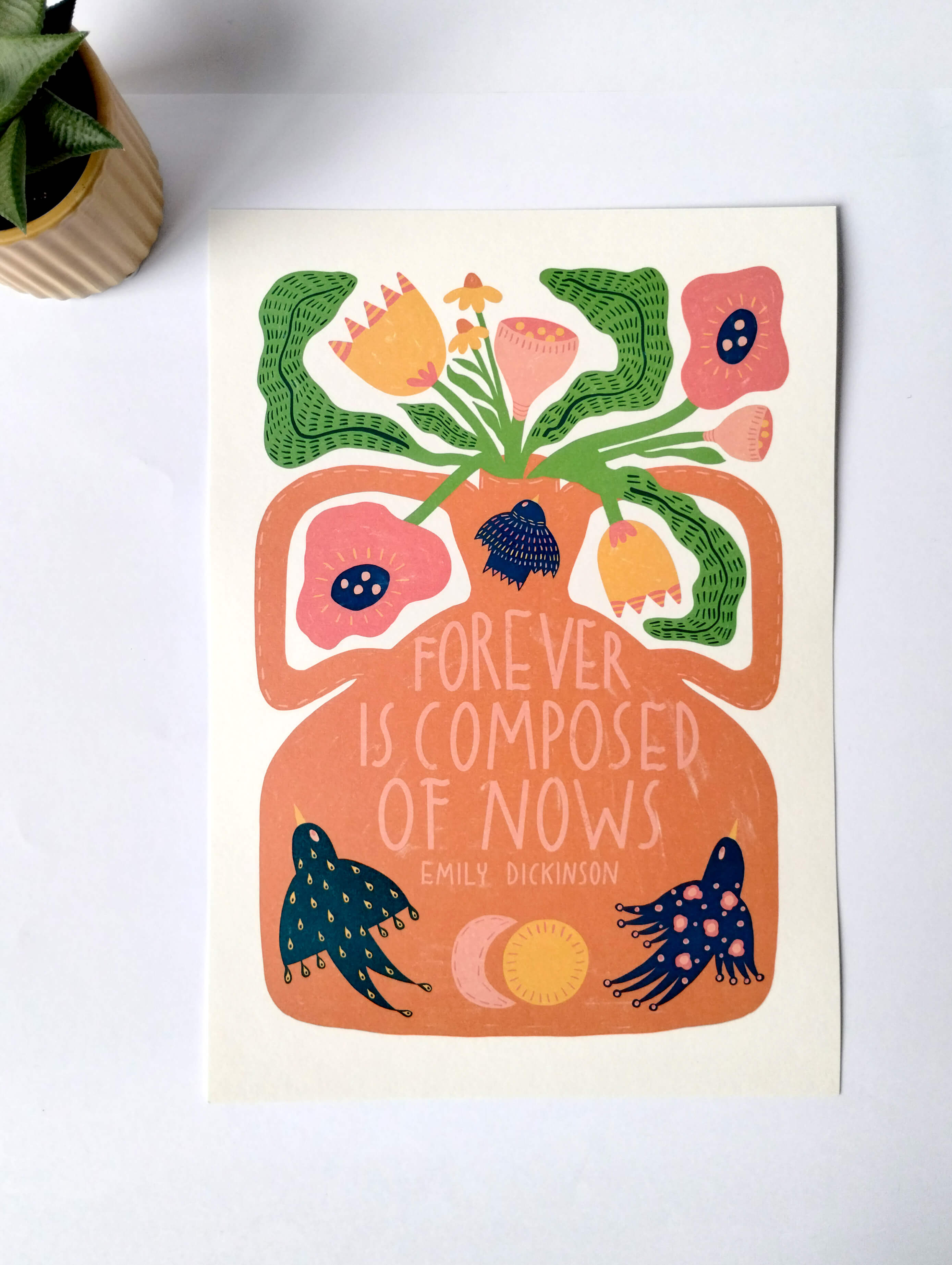 This A4 art print brings Emily Dickinson's famous line to life. This sweet and whimsical illustration is perfect for any quirky and eclectic living space bringing a pop of colour to the walls. Sustainably printed in the UK, it would also make a lovely gift.