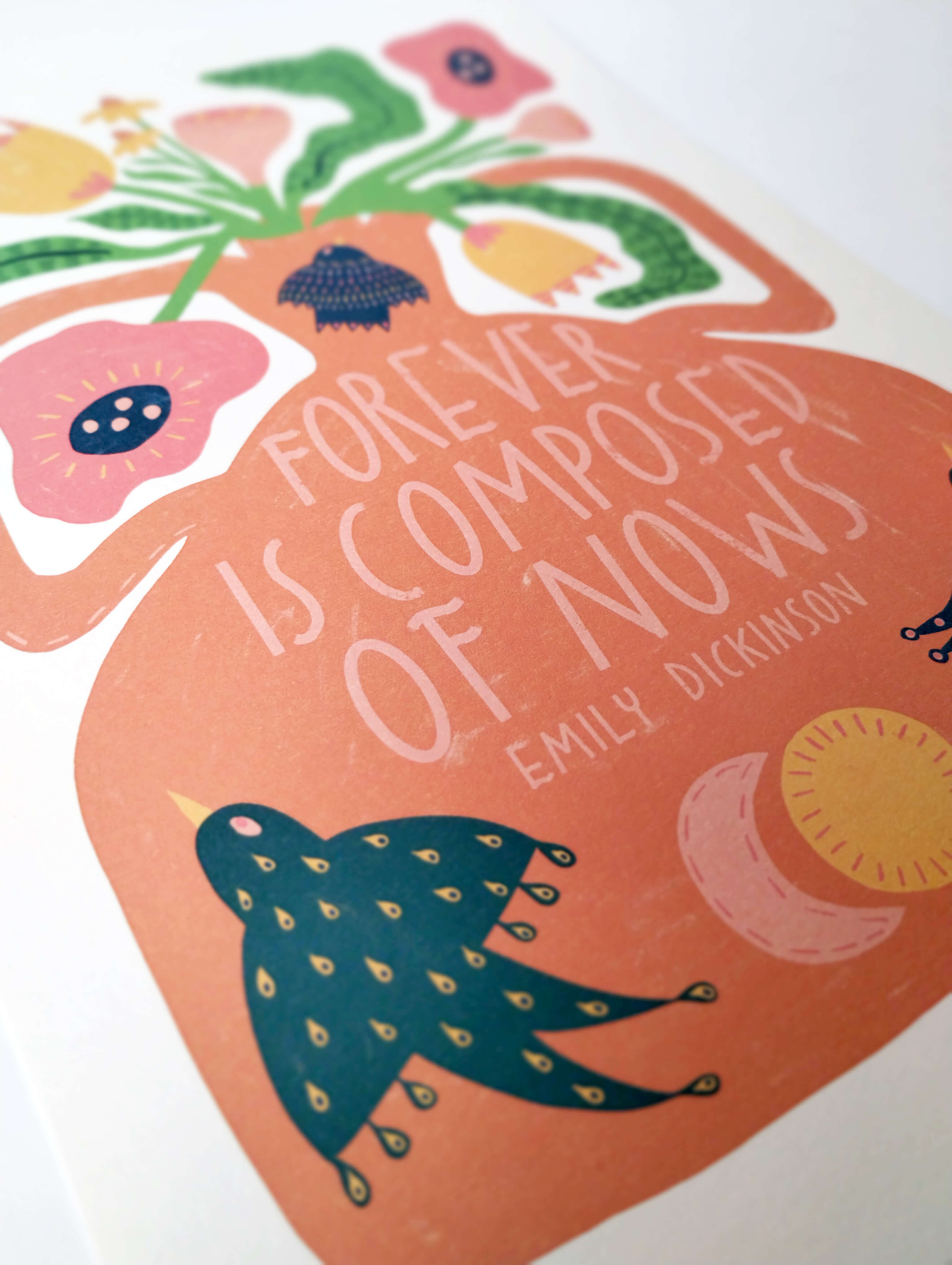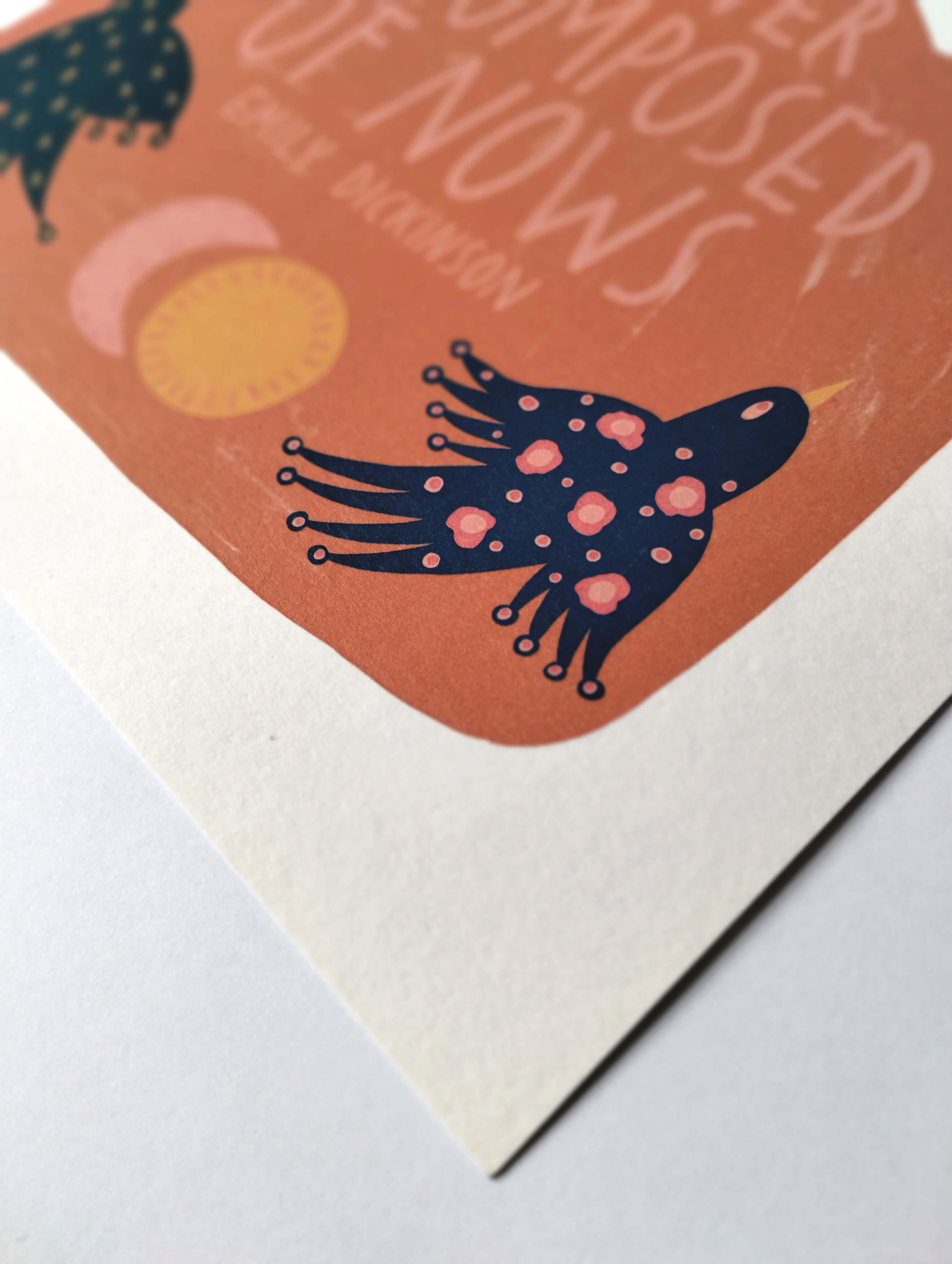 This A4 art print brings Emily Dickinson's famous line to life. This sweet and whimsical illustration is perfect for any quirky and eclectic living space bringing a pop of colour to the walls. Sustainably printed in the UK, it would also make a lovely gift.